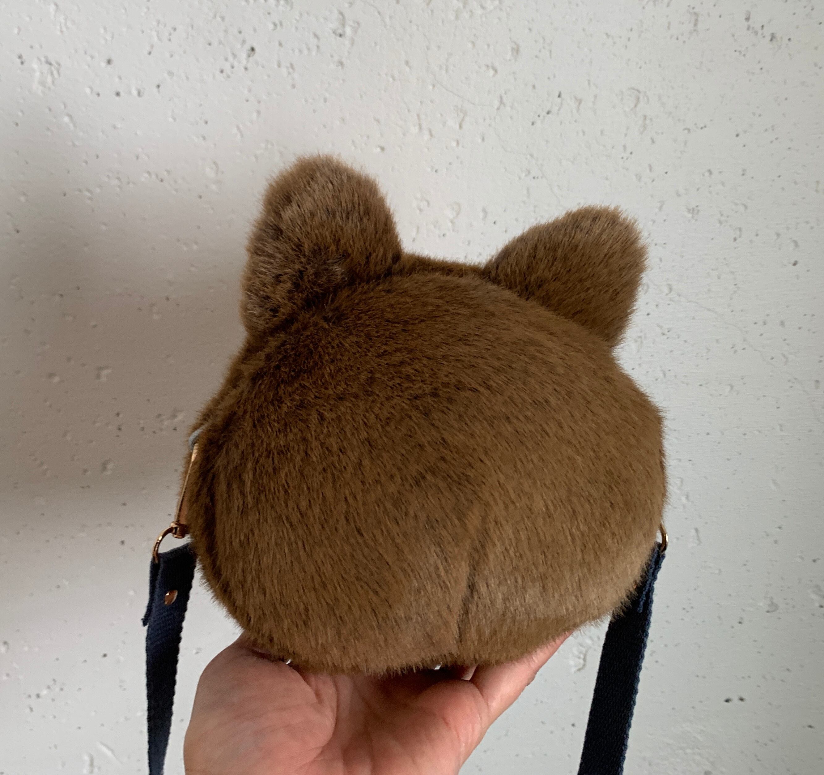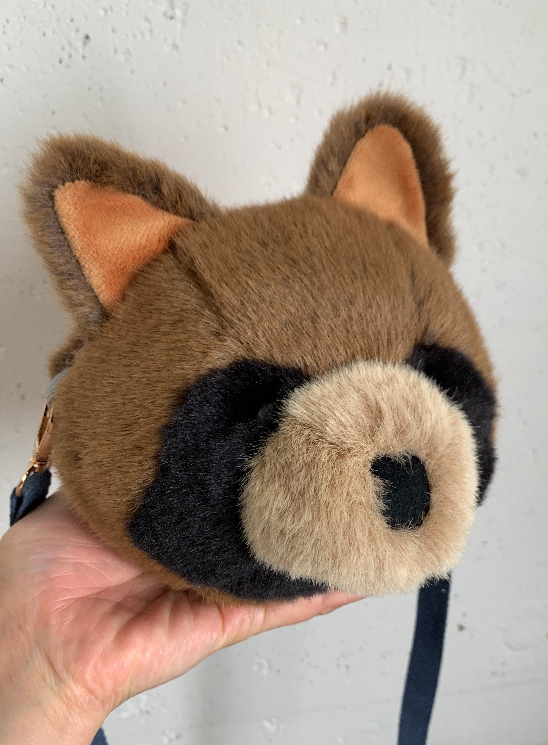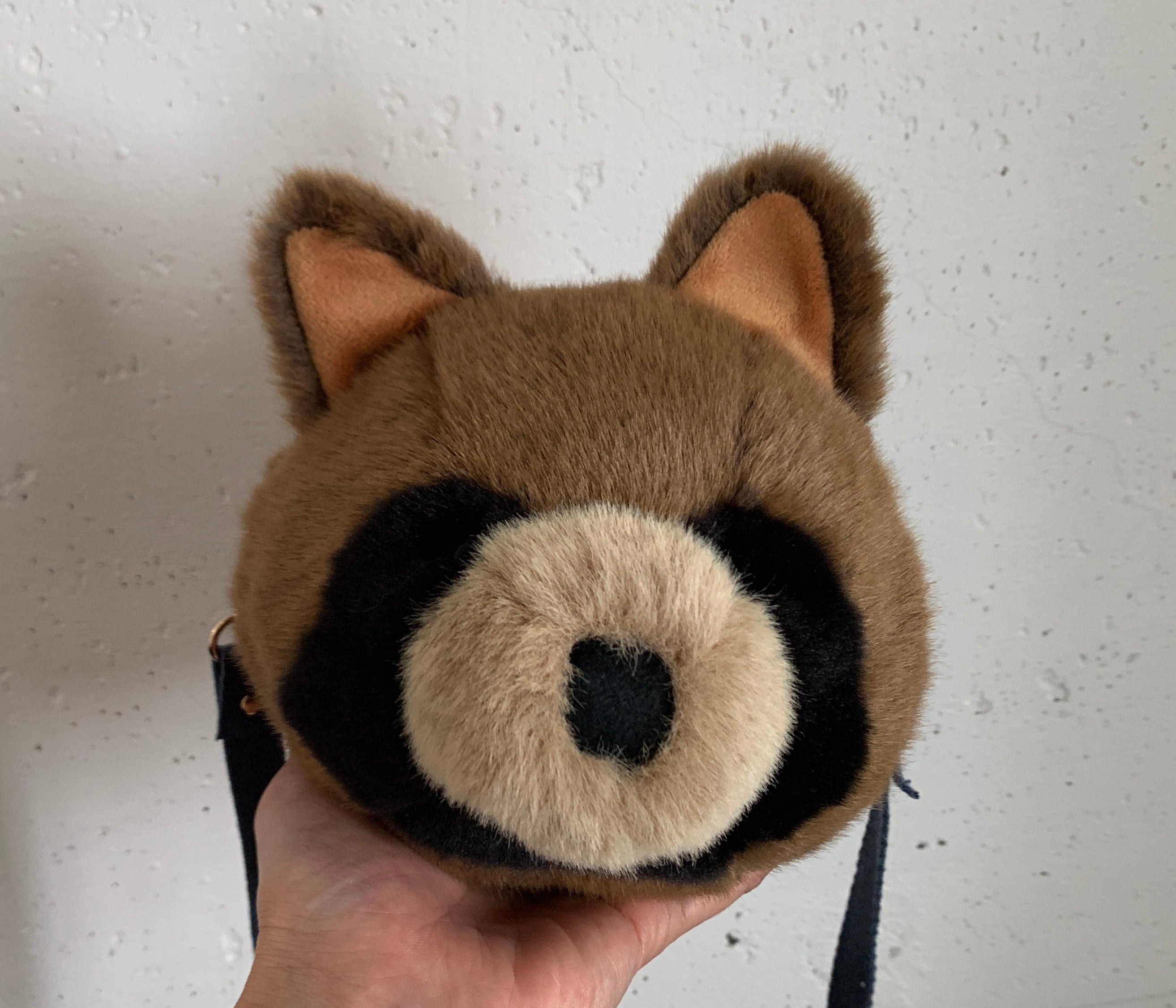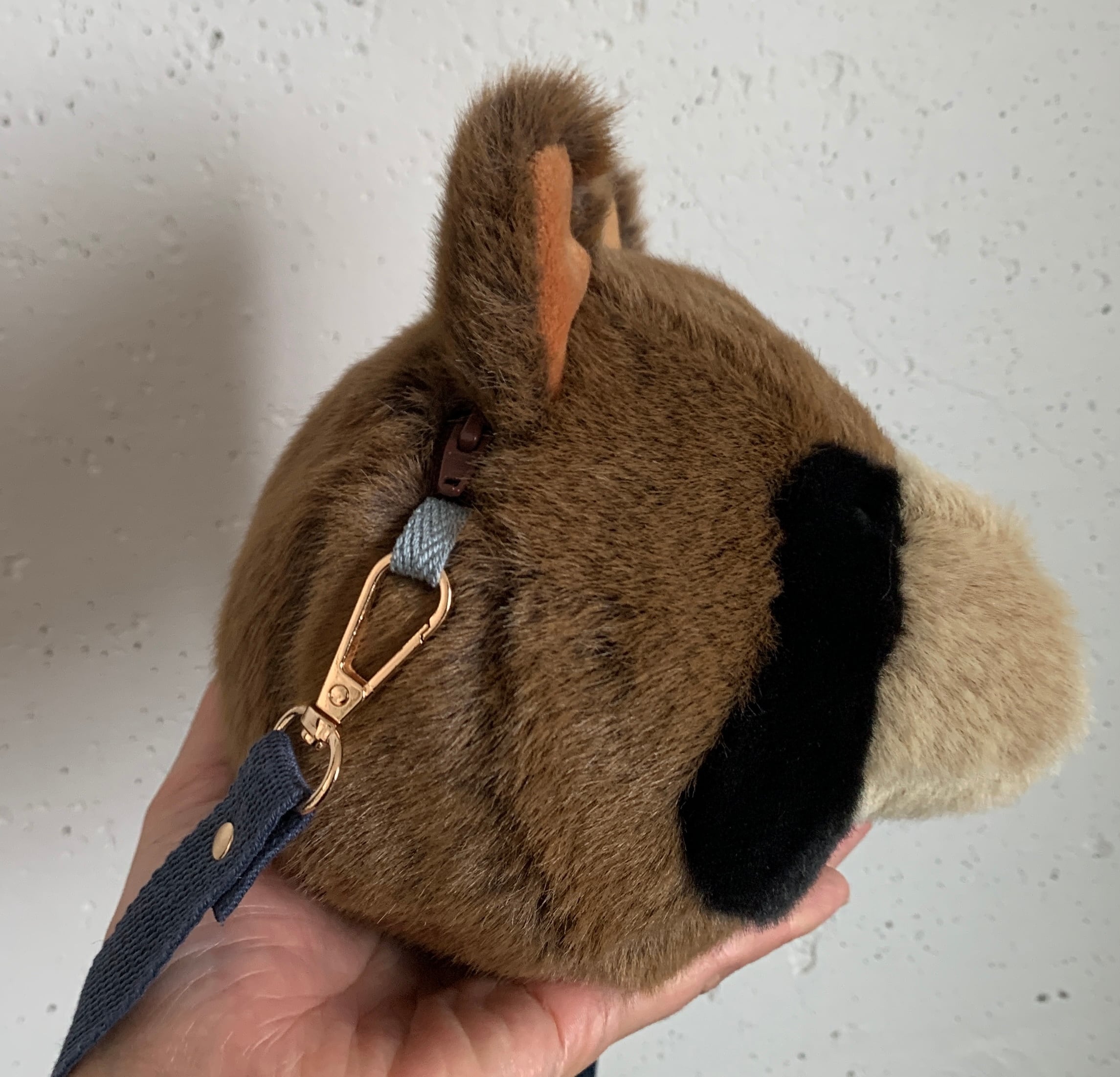 タヌキの夏毛の頃の、ちょっと黒くなっている様子をポーチにしました。毛足は1.7センチです。ちょっとエゾタヌキっぽく鼻まわりが白くなっています。